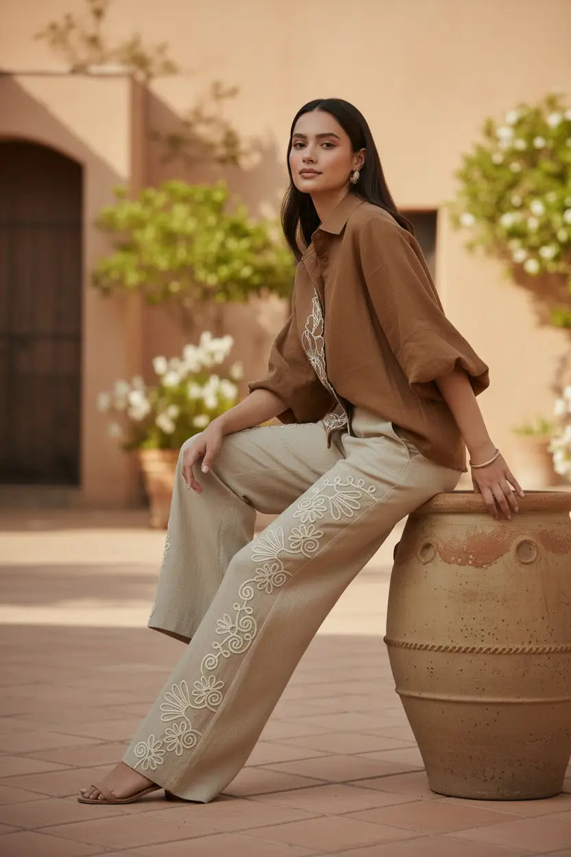An ode to earthy elegance — our Desert Bloom Coord Set pairs a warm cinnamon-brown shirt with soft beige wide-leg pants, crafted in breathable crushed cotton linen for effortless sophistication.