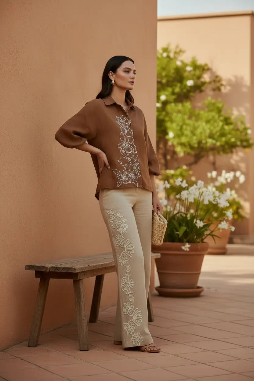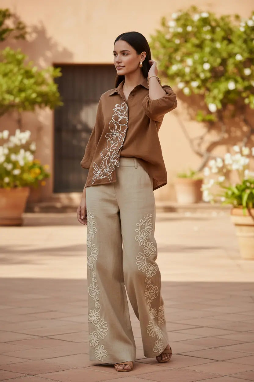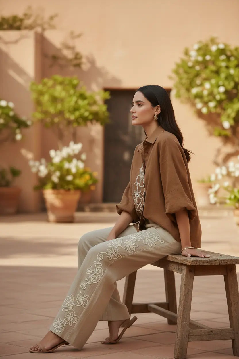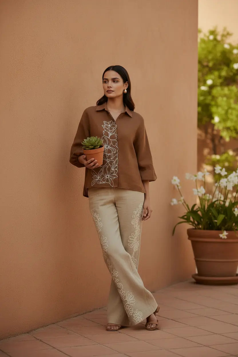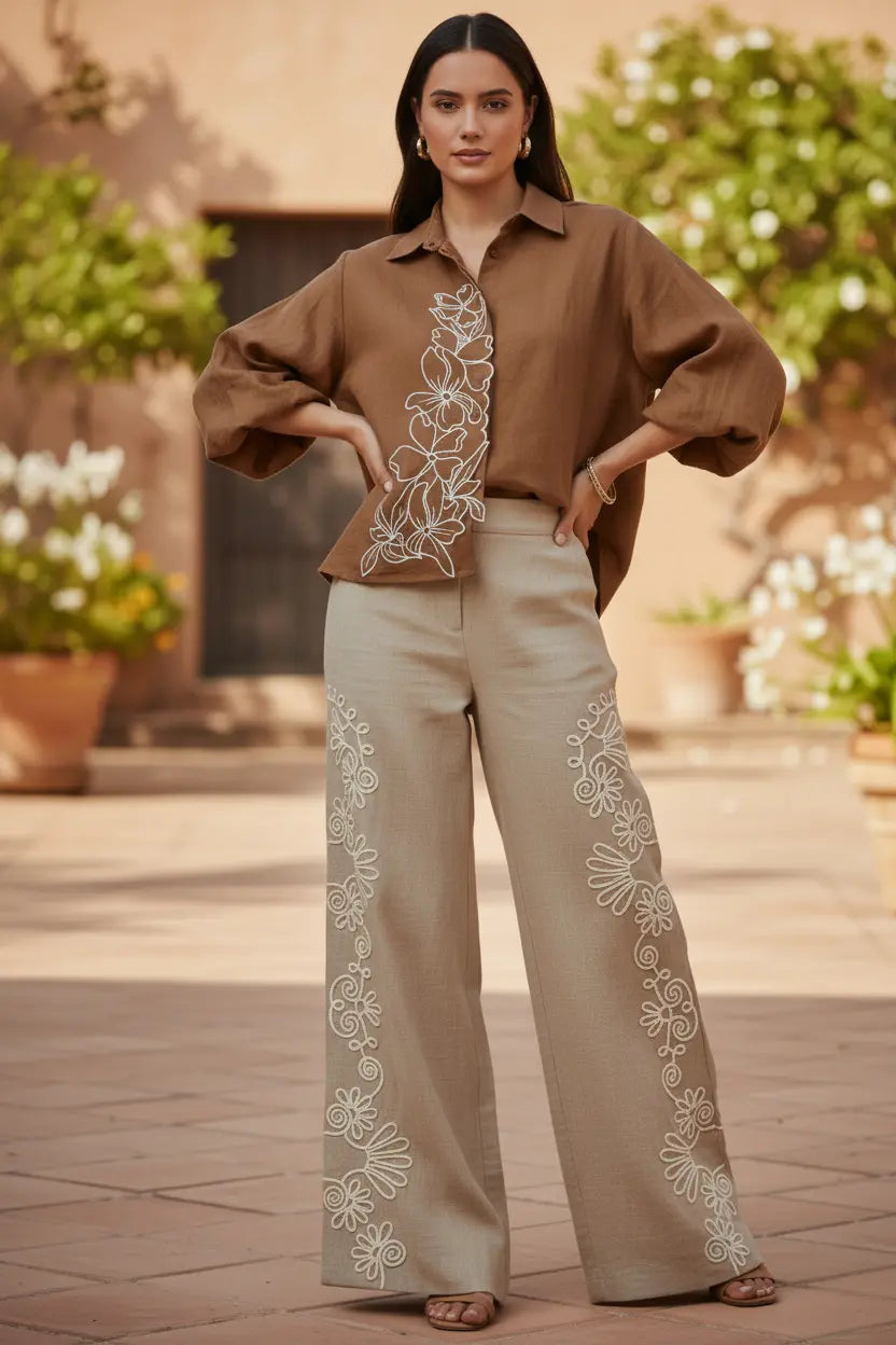 An ode to earthy elegance — our Desert Bloom Coord Set pairs a warm cinnamon-brown shirt with soft beige wide-leg pants, crafted in breathable crushed cotton linen for effortless sophistication. Delicate white resham thread embroidery cascades in floral motifs across the shirt and pants, creating a harmonious blend of artisanal charm and contemporary tailoring. Designed for refined daywear, vacation styling, and elevated casual dressing, this relaxed silhouette embodies timeless grace with modern comfort.